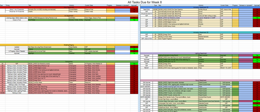 Developing and testing styles of the sheets to track our progress was fun but challenging at first. I started with a working list for our first week then moved into attempting department sheets but with not many people willing to cooperate it eventually evolved into a weekly due date task sheet which I found to be the best due to the small scale of the project! After setting up a Google Sheet I went to Shotgun to translate the information and continued to track the entire project by using both platforms!